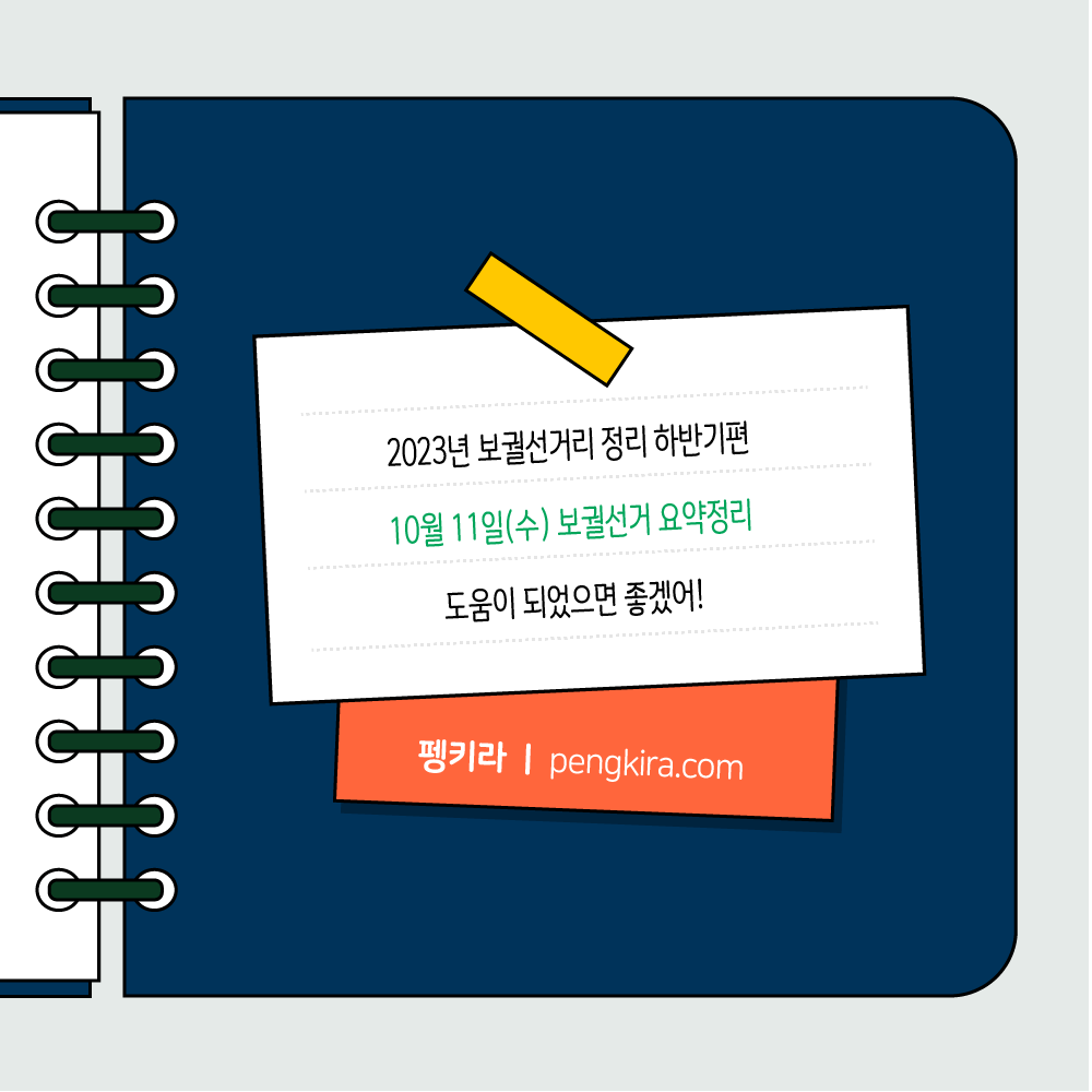 다가오는 10월 11일(수)은 2023년 하반기 보궐선거가 있는 날입니다. 이번 하반기 보궐선거가 끝나면 올해의 재·보궐선거는 종료됩니다. 내년 재·보궐선거는 2024년 국회의원 총선일에 실시될 예정으로, 관련 선거 일정은 추후에 업데이트하도록 하겠습니다.